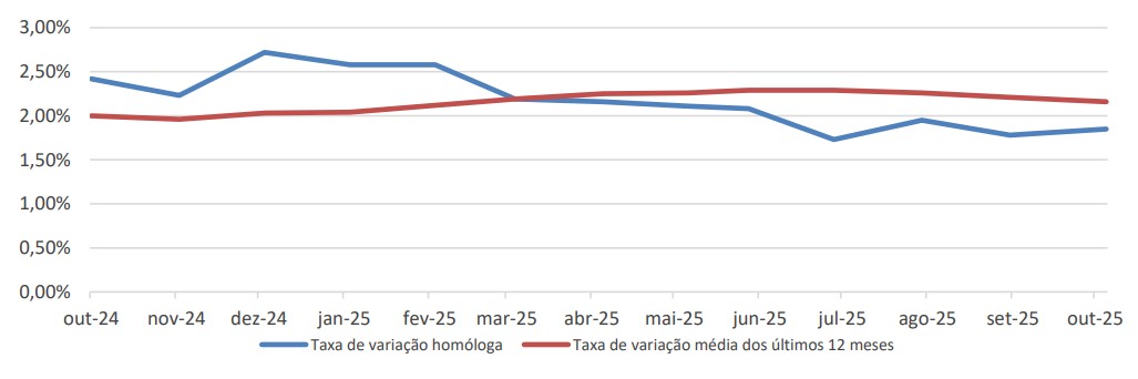 A taxa de variação homóloga do IPC, “Total”, de outubro, situou-se nos 1,85%, aumentando 0,07 pontos percentuais em relação ao mês de anterior.