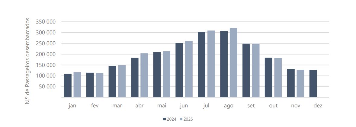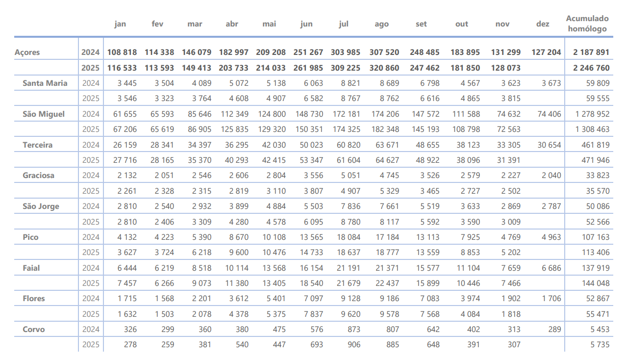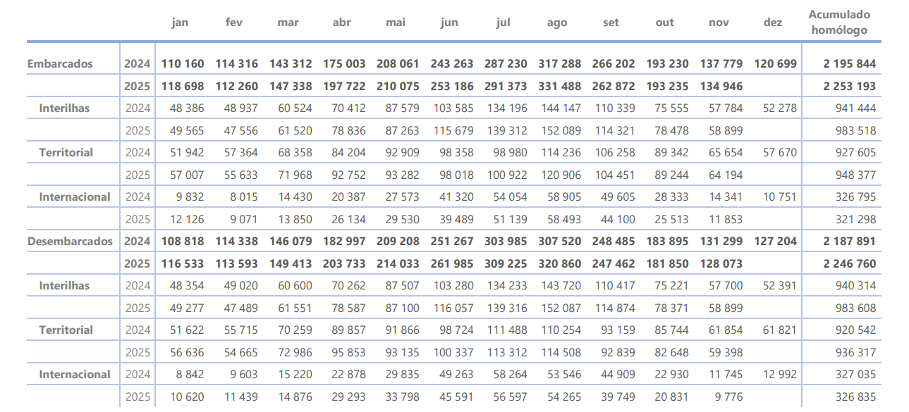 No mês de novembro de 2025 desembarcaram 128 073 passageiros nos aeroportos dos Açores, verificando-se um decréscimo homólogo de 2,5%. Nos voos territoriais desembarcaram 59 398 passageiros (decréscimo homólogo de 4,0%), nos voos interilhas 58 899 passageiros (acréscimo homólogo de 2,1%) e nos voos internacionais 9 776 passageiros (decréscimo homólogo de 16,8%).