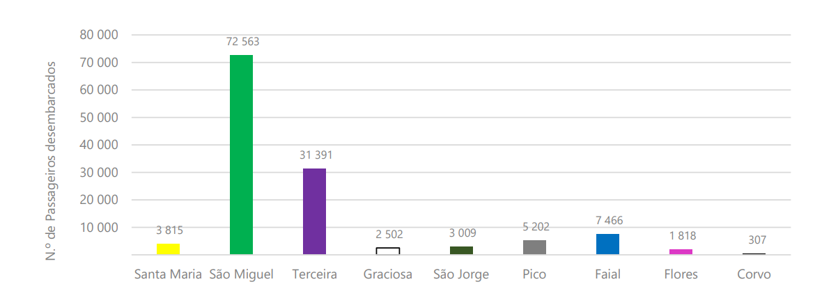 Neste mês, a ilha de São Miguel, com 72 563 passageiros desembarcados, concentrou 56,7% do total de passageiros desembarcados nos aeroportos dos Açores, seguindo-se as ilhas Terceira, com 31 391 (24,5% do total), Faial, com 7 466 (5,8% do total), e Pico, com 5 202 (4,1% do total).